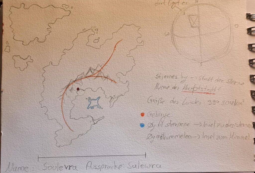 The Picture you see here is the Sketch of the landmap. After reading and watching so many videos and texts about Norway I placed the land at a simliar spot on the globe. With a long Mountainchain and alott of water sorounding it.
